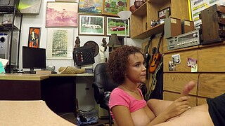 Curly hottie gets on bouncing on gigantic cock until creampied