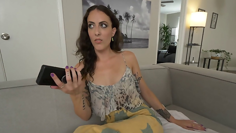 Shy Brunette in Thigh Highs Fingers Her Pussy on the Couch
